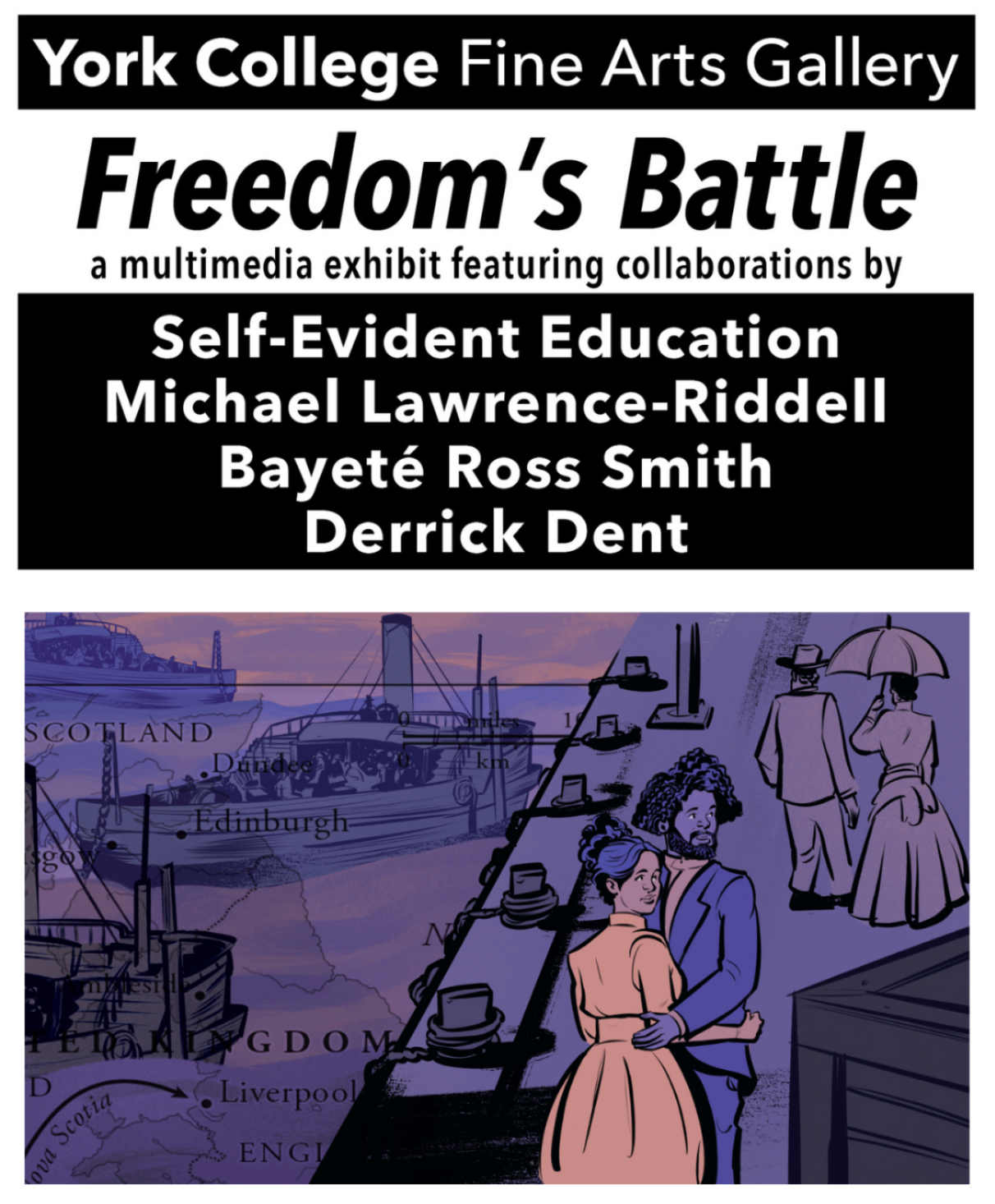 Freedom’s Battle is an exhibition presented by Self-Evident Education in partnership with York College. It is designed as an interdisciplinary learning space that bridges visual art, film, and historical inquiry. Drawing from Self-Evident Education’s multimedia projects, the exhibition uses creative practice as a pedagogical tool—using film, visual art, sound, and archival materials to critically examine the histories and enduring legacies of systemic racism in the United States. Grounded in historical inquiry and creative practice, the exhibition invites audiences to consider how the past shapes the present—and how a deeper understanding of history can inform the work of building a more just future. Self-Evident Education is an educational non-profit that creates multimedia curriculum materials and curates learning experiences to support educators to teach authentically on the challenging and essential histories and legacies of systemic racism in America. Featuring artwork by Derrick Dent, behind-the-scenes film materials, excerpts of documentary films, and Got the Power: Cotton and Sugar Boomboxes by DPI Professor Bayeté Ross Smith, the exhibition foregrounds process, context, and inquiry. Storyboards, sound, and moving image installations offer insight into how historical research, artistic collaboration, and storytelling intersect to produce meaning. Conceived as an active site of learning, the exhibition encourages dialogue across disciplines and supports classroom engagement, facilitated screenings, and public conversation. By situating art-making within broader social and historical frameworks, the exhibition invites the campus community to reflect on the role of education and storytelling in understanding the past and shaping more just futures.