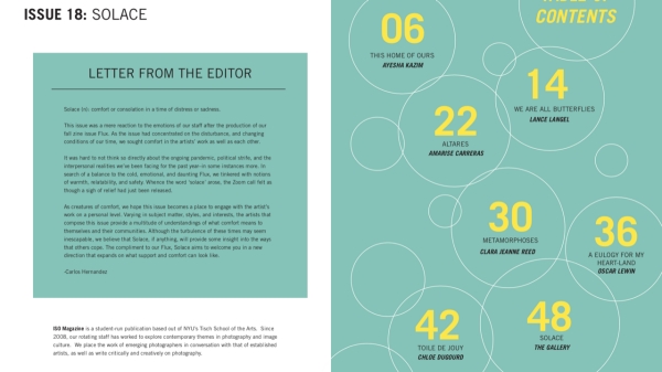 Photog & Imaging student publication ISO Magazine released SOLACE: Spring 2021. Students and contributors from around the globe worked together to design this special digital edition.