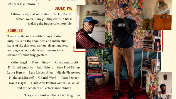 Sources (Who helped author you/your project? Mentors? Collaborators?): The capacity and breadth of my creative output sits on the shoulders and intellectual labor of the thinkers, writers, doers, makers, and sages who model what it means to be in service of something greater: Kathy Engel, Karen Finley, Grace Aneiza Ali, Dr. Sheril Antonio, Pato Hebert, thee Fred Moten, Laura Harris, Luis Rincón Alba, Nicole Fleetwood, Nicholas Mirzoeff, Chanel Ward, Patti Pearson, Kaiko Hayes, Tisch-Arts Politics Cohort ’20 & ’21 and the scholars of Performance Studies. They and a host of others have taught me, in one way or another that this project called life is about unmaking one world, and the making of another one. Forever indebted.