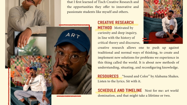 Background (How did you find out about Tisch Creative Research?): One of my strongest attributes is resourcefulness, but also, I read *all* of the emails sent to my NYU email address. It is here that I first learned of Tisch Creative Research and the opportunities they offer to innovative and passionate students like myself and others.